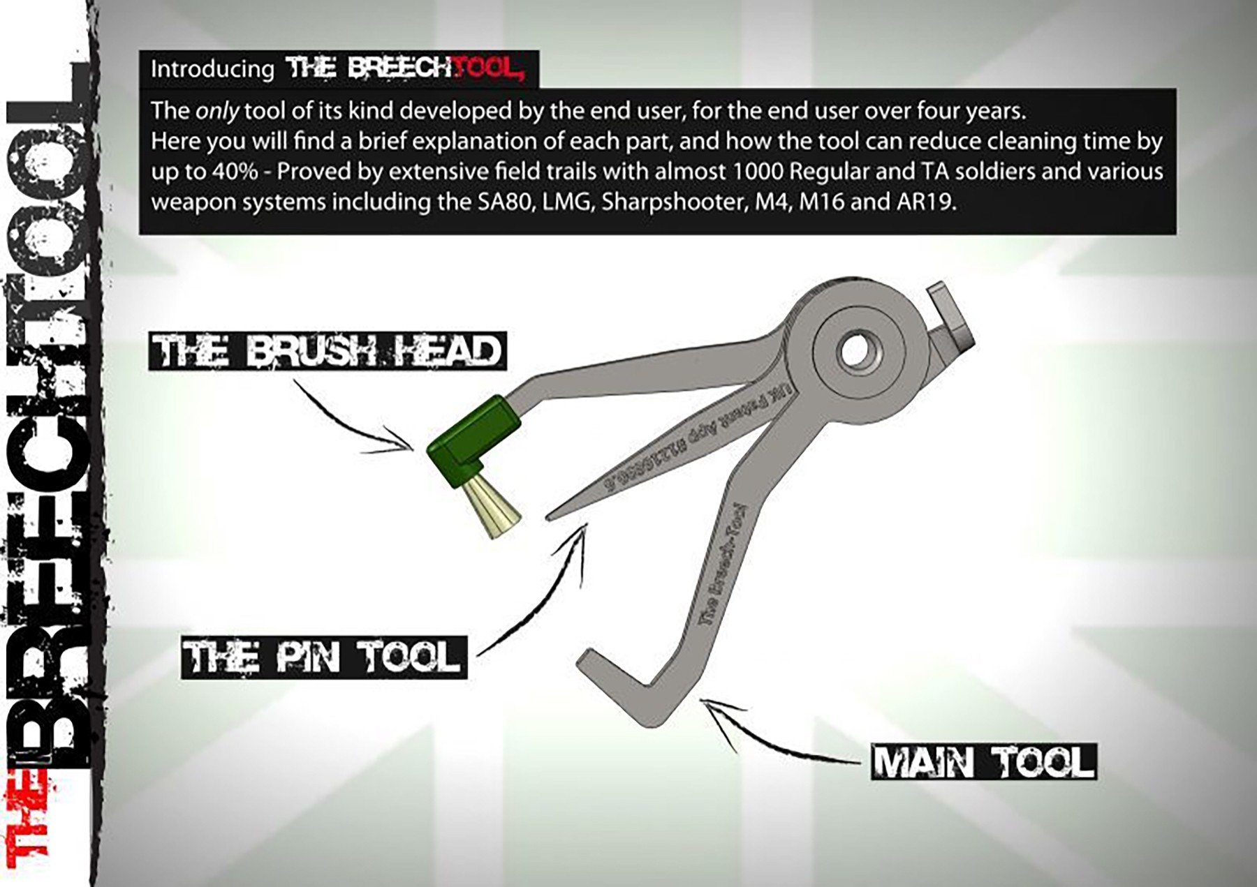 The Breechtool™ is the result of product development and research by the end user, for the end user with almost 1000 British regular and Reserve soldiers across the armed forces involved in the lifecycle of the tool. Using human centered design, we addressed a vast range of end users including The Special forces, British Army, Navy, USMC, Tactical branches of security, US Army and the Royal Marines. We also officially supply Police and Law enforcment and military surplus stores that also sell online internationally.