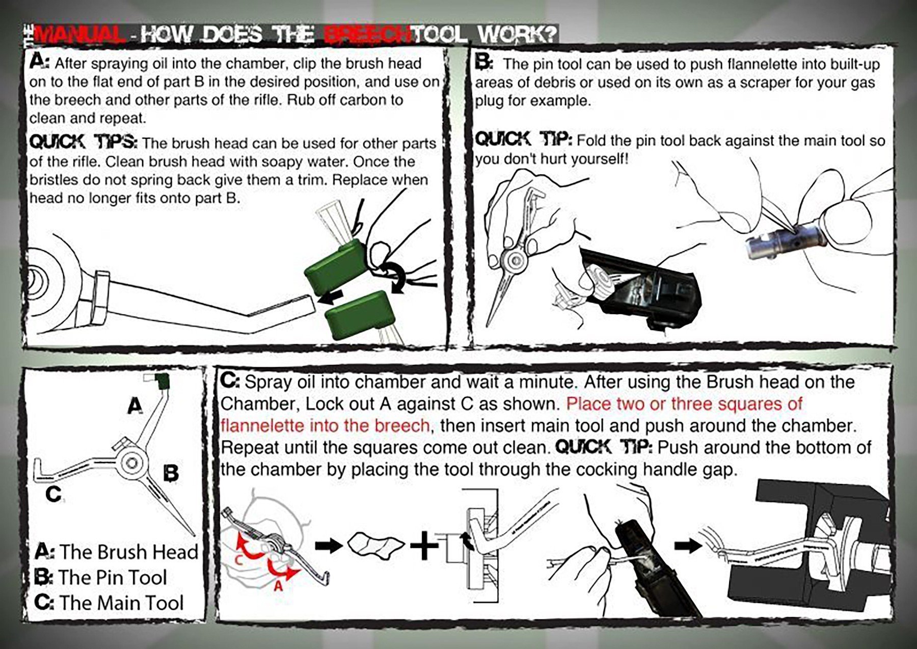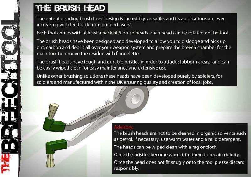 Specifically the barrel extension chamber, lugs or breech, its patented design and disposable nylon brushes are effective on any weapon, rifle or machine gun, military or sports hunting combined with tactical wear.