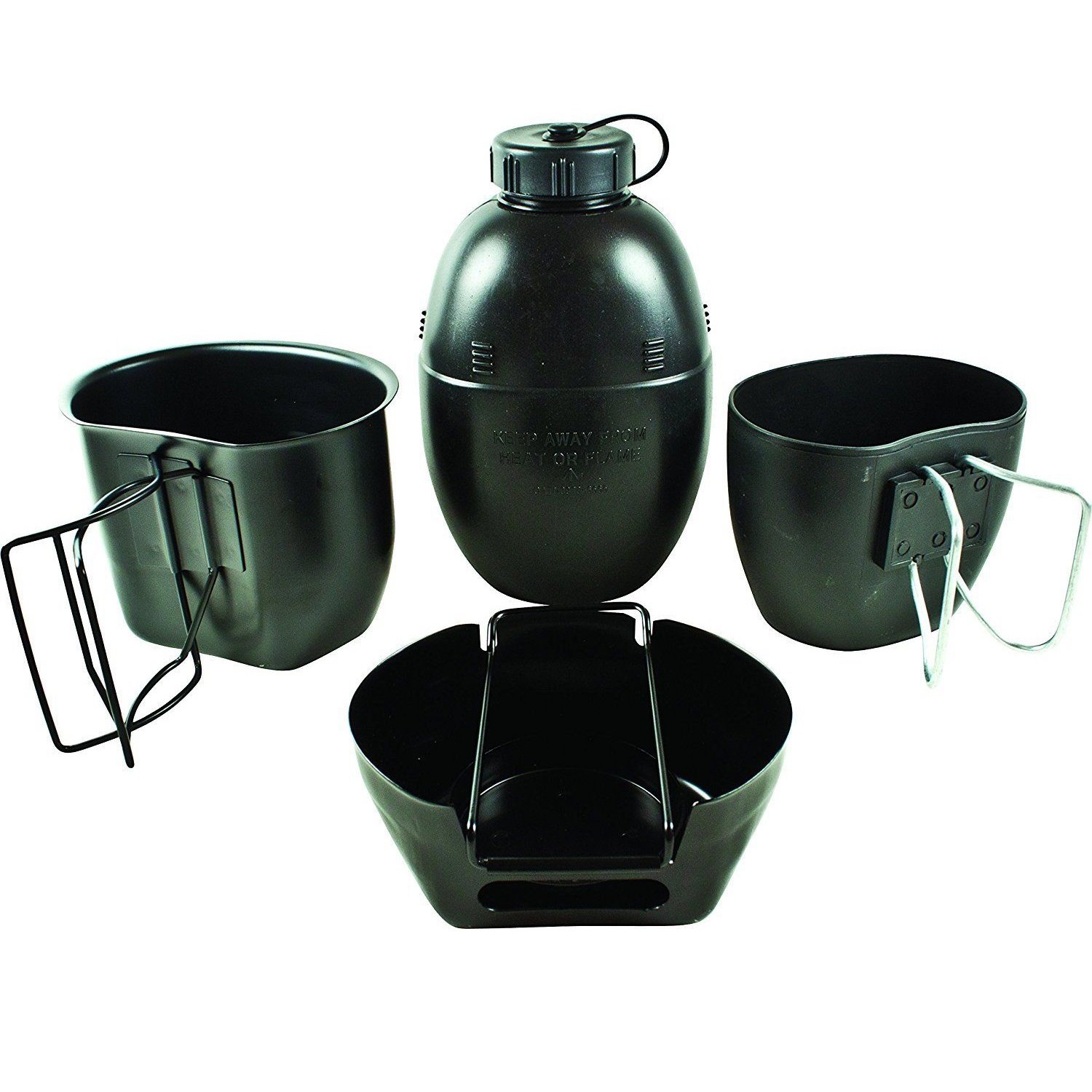The Crusader Cooking Unit complete with a NATO issue water bottle and plastic mug, available in Stainless Steel Silver or Black PFTE finish