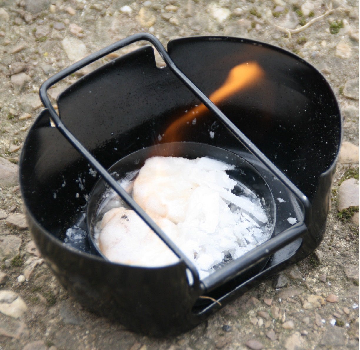 An integral folding arm allows the cup to fit securely over a fuel crucible where gel fuel or solid hexamine fuel blocks can be lit.
