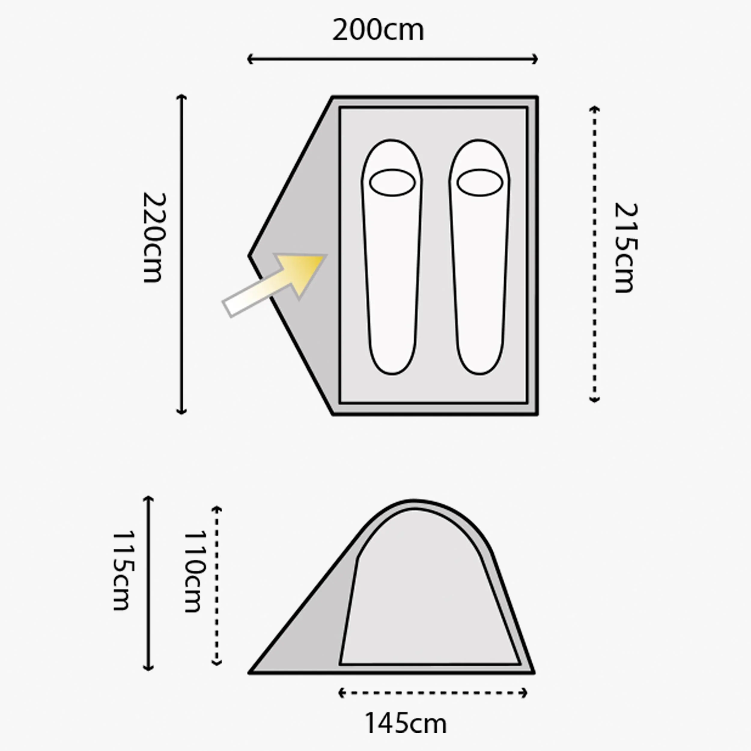- Dimensions: Outer: 200cm x 220cm x 115cm Inner: 145cm x 215cm x 110cm.Pole width: 7.9mm